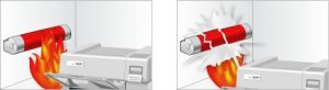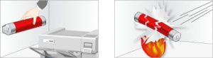 When a fire breaks out in a small enclosed area and temperature rises, extinguishing liquid simultaneously begins to heat and as a result, the liquid starts to extend in the glass ampoule. When the temperature of the extinguishing liquid is approximately 85°C ± 5°C the glass breaks into pieces which allows the liquid to drop into the area, where endothermic process begins. It takes the energy from the fire and starts to cool the area. As a side product of this endothermic reaction, small quantities of nitrogen and carbon dioxide are released. Their function is to prevent the entrance of oxygen to the burning area. Remaining components that do not decay, form a protective layer over the surface of the extinguishing liquid, which prevents re-ignition.